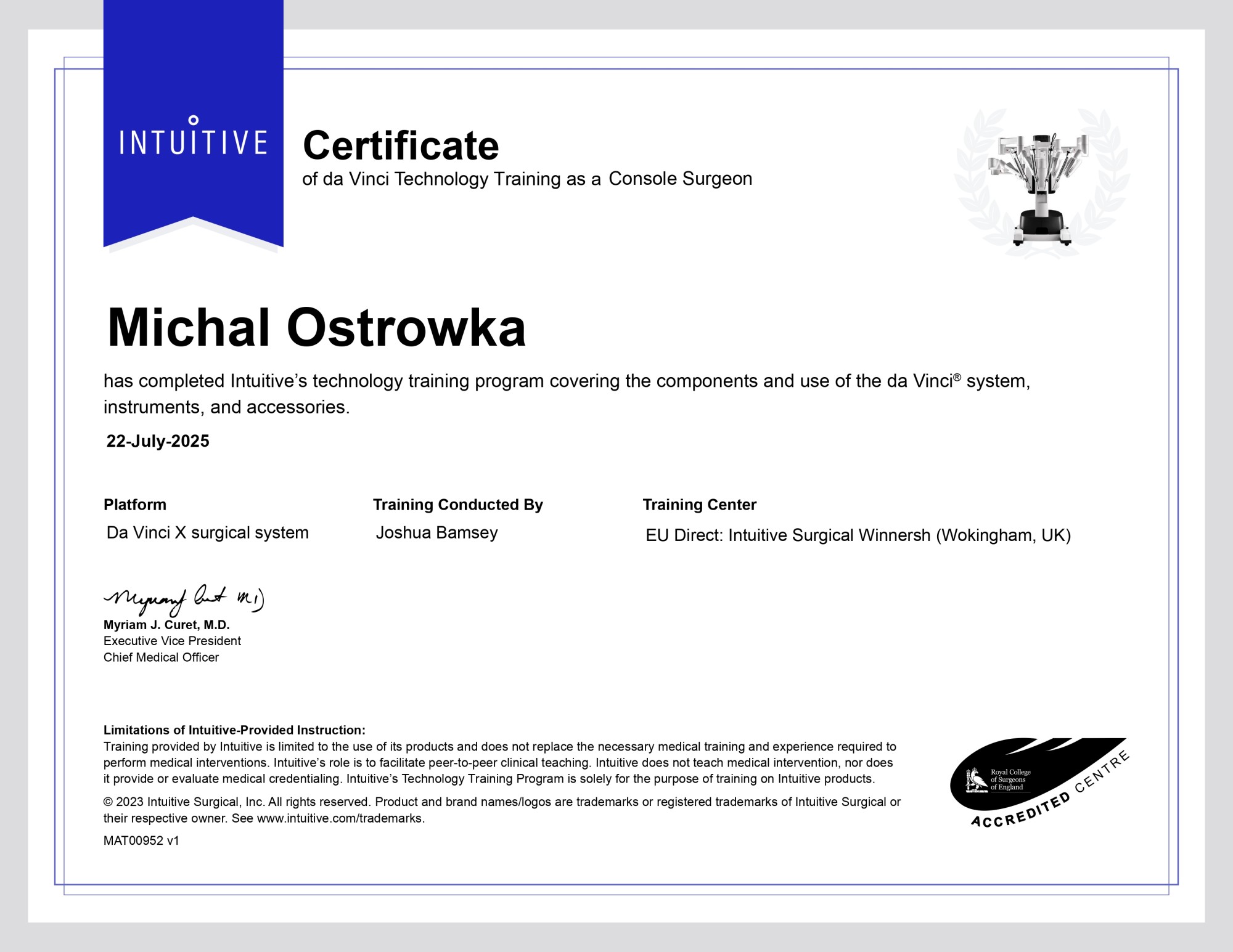 Z ogromną radością informujemy, że lek. Michał Ostrówka, specjalista urolog, FEBU, dołączył do grona certyfikowanych operatorów robota chirurgicznego da Vinci. Urologiczne operacje robotyczne będzie wykonywać w Szpitalach Mazovia w Warszawie i Częstochowie.